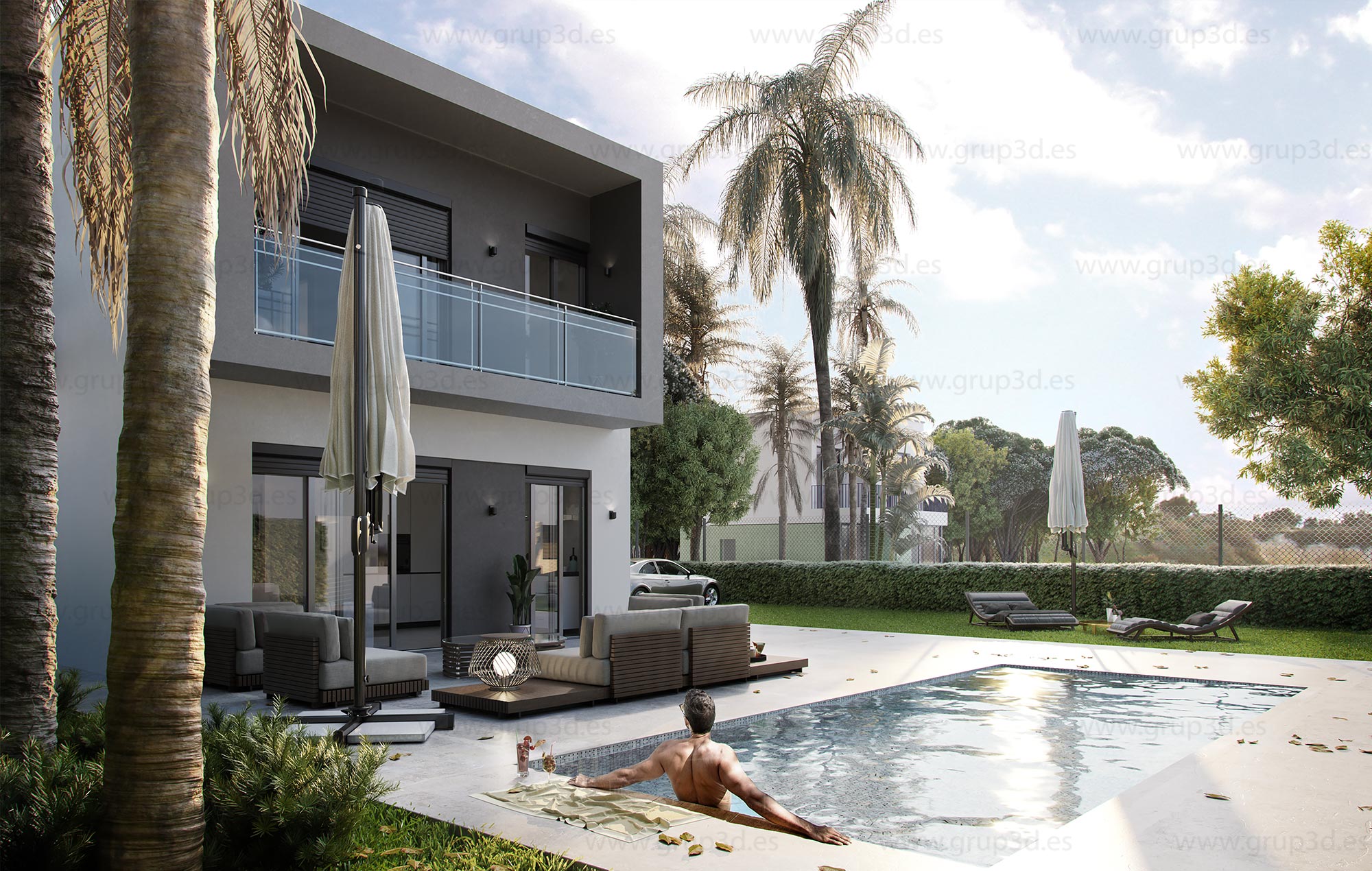 Renders de arquitectura exteriores e interiores, diurnos y nocturnos, vistas aéreas, integraciones, planos 3D, alzados. Todo el contenido digital necesario para la venta de proyectos arquitectónicos de viviendas.